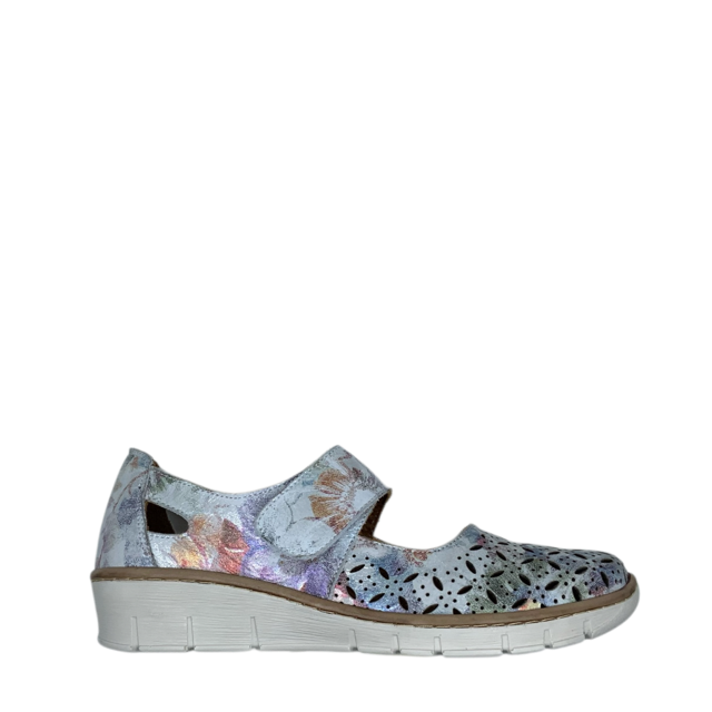 The CP395-22 is a light and breezy summer shoe designed for all-day comfort and effortless style. Featuring soft punched leather uppers for breathability and a touch of detail, it’s perfect for warm-weather wear. The secure Velcro strap and supportive closed back provide a snug, comfortable fit, while the small wedge adds just the right amount of lift. A flexible sole ensures ease of movement with every step, making this shoe ideal for casual outings or long days on your feet. Available in pretty shimmer metallic colour.