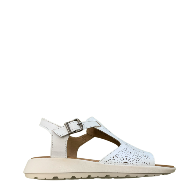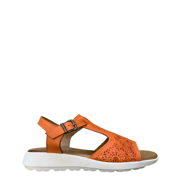 Step into summer in style with the all-new Penelope sandal. Designed with a wide leather upper adorned with delicate laser-cut detailing, an adjustable strap for the perfect fit, and a luxuriously soft footbed for ultimate comfort. Featuring a subtle wedge heel, these sandals come white and a vibrant orange to brighten your day.
