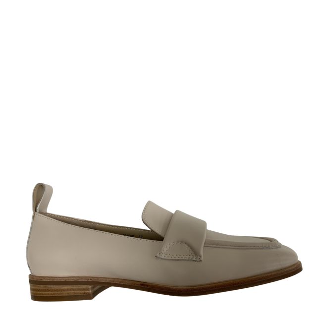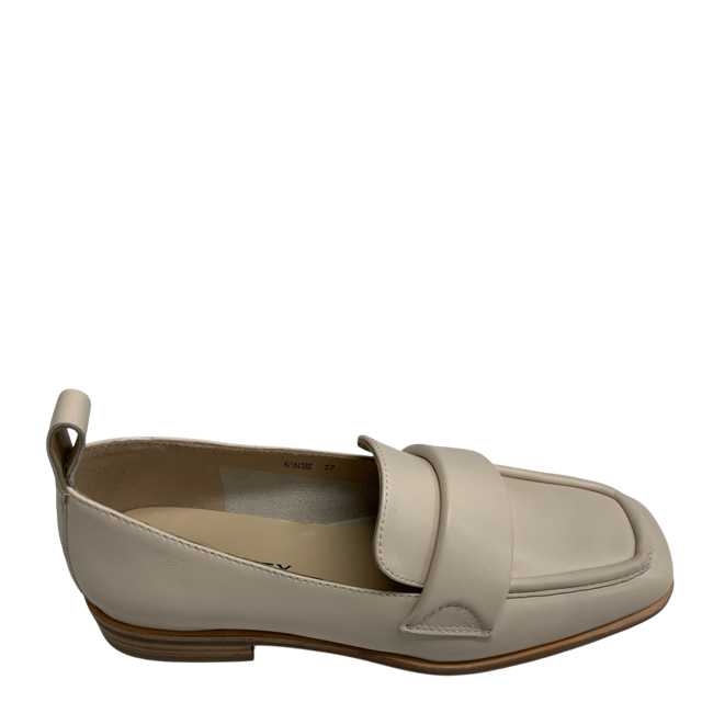 BRESLEY APACHE slip-on loafer offers a sleek, minimalist look in the soft neutral tone that pairs effortlessly with everyday outfits. A smooth cream leather upper, the shoe features a structured square toe and wide statement, slightly puffy, strap across the front. A low stacked heel adds a subtle lift. Look sharp for work or play.