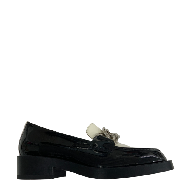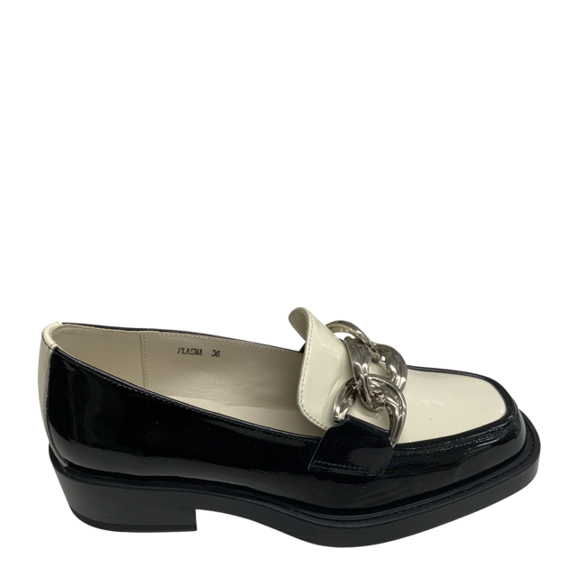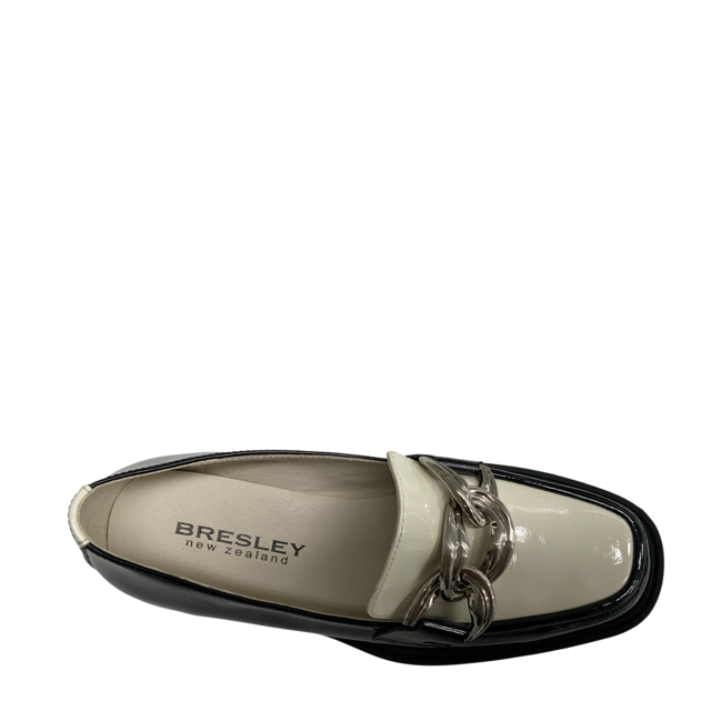Step into effortless style with this striking loafer PLASMA by BRESLEY. Featuring a black patent leather finish with a contrasting cream patent vamp and chain detail, this loafer blends classic tailoring with fashion. This loafer is a versatile wardrobe essential that transitions easily from work to weekend. Designed in New Zealand.