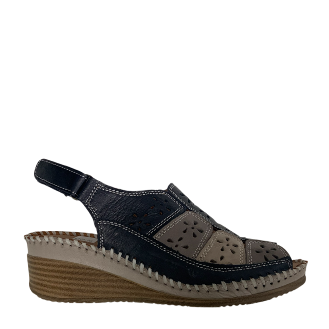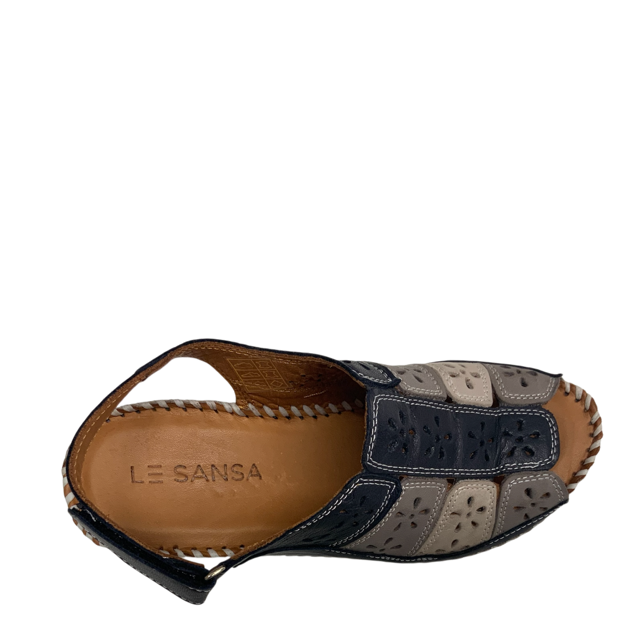 LE SANSA KIRRA sandal in tan multi or navy multi leather combines style and comfort with a medium - low wedge heeL of aprox 4.5cm and cushioned footbed, an adjustable sling-back strap provides a secure fit. Attractive summer shoe everyday wear and to team with trousers or dresses.