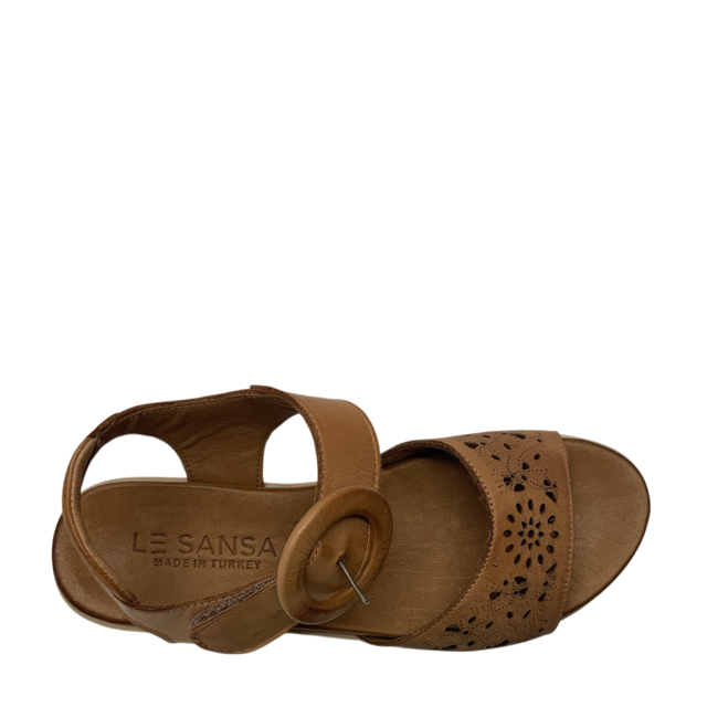 The MAC by LESANSA sandal in tan leather combines style and comfort with a low wedge heel and cushioned footbed, featuring a laser-cut design across the front, a Velcro strap with a round feature buckle for easy fit, and made from soft leather for everyday wear - a perfect blend of casual elegance and comfort.