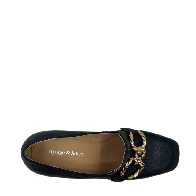 Step up your shoe game—literally! Keefe is the heeled loafer by Django & Juliette that means business while keeping things effortlessly chic. Crafted from leather with a sleek, structured silhouette, this timeless style brings a polished finish to any outfit. Whether you're bossing it up at work or heading out for a stylish brunch, the 7cm block heel gives you the perfect lift without compromising on comfort. Black leather with gold buckle trim across front.