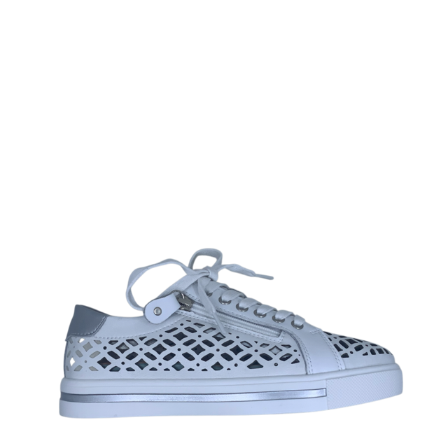 Metallics are the height of fashion this season, and the Nova sneaker is the easiest way to work the trend without giving up comfort and metallics just go with all colours! Made from leather with a subtle shimmer, the cut-out design adds a touch of style while providing breathable design for warmer days. The side zip means you can slip them on and off in seconds, and a cushioned footbed for all-day wear!