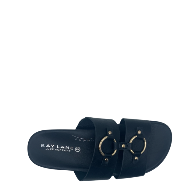 Step into modern ease with Zuma in black leather. Featuring wide double straps with polished gold hardware, this sandal delivers a sleek look with everyday versatility. The cushioned footbed and lightweight sole ensure comfort, making it a staple for warm-weather dressing.