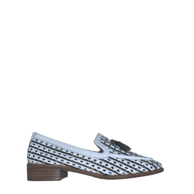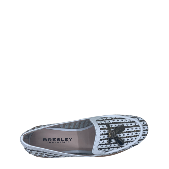 Add a touch of chic sophistication with BRESLEY APPLES woven leather loafer. In a fresh mix of white and dark gold, finished with a matching tassel detail, this slip-on style is both effortless and eye-catching. Perfect for dressing up or smart casual with comfort! Designed in New Zealand.